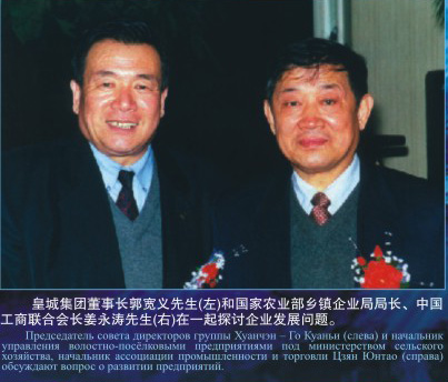 皇城集團董事長郭寬義先生(左)和國家農(nóng)業(yè)部鄉(xiāng)鎮(zhèn)企業(yè)局局長、中國工商聯(lián)合會長姜永濤先生(右)在一起討論企業(yè)發(fā)展問題