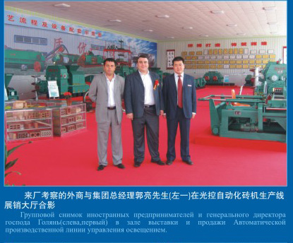 來廠考察的外商與集團總經(jīng)理郭亮先生(左一)在光控自動化磚機生產(chǎn)線展銷大廳合影