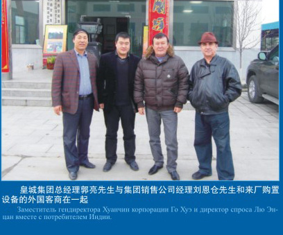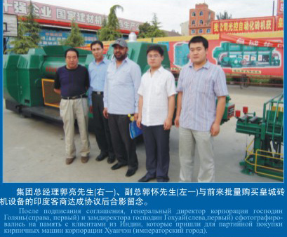 集團總經(jīng)理郭亮先生(右一)、副總郭懷先生(左一)與前來批量購買磚機設(shè)備的印度客商達(dá)成協(xié)議后留影